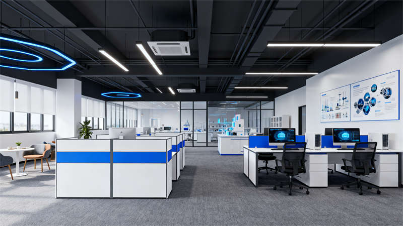 室內空間設計以 “高效便捷” 為核心,各功能區(qū)域劃分清晰且銜接流暢。生產(chǎn)區(qū)域注重動線規(guī)劃,確保設備擺放與人員操作互不干擾,地面選用耐磨易清潔的材質,墻面以淺色調為主,增強空間明亮度,減少視覺疲勞;倉儲區(qū)域通過分層貨架與合理照明設計,提升儲物效率與取用便利性;辦公區(qū)域融入簡約辦公家具,搭配柔和燈光,營造舒適的工作氛圍;質檢區(qū)域則強調視野開闊,便于工作人員精準操作;休息區(qū)域注重溫馨感,為員工提供放松空間;配電與設備機房采用規(guī)整的管線排布與防護設計,兼顧安全性與維護便捷性;通道區(qū)域通過清晰標識與防滑處理,保障人員通行安全。整體設計從生產(chǎn)、辦公、休憩等多維度出發(fā),讓廠房既滿足工業(yè)生產(chǎn)的實用需求,又具備舒適有序的空間體驗。