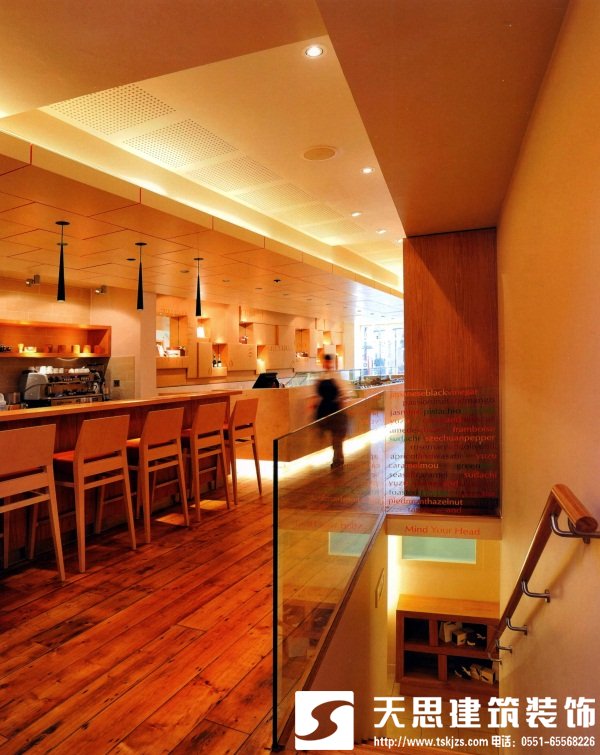 店鋪后部特別定制的玻璃吊燈象征著可可豆的豆莢。其他的設計元素包括回收的松木地板、石灰石柜臺和臺面、鮮橙色皮革、橡木制品以及長條噴漆天花板。北京餐廳設計師在處理天花板時,將不同的元素統一在一起,突出了空間的長度并將人們的眼球吸引到店鋪后部。地下室主要是用來展示的廚房,里面設置著巧克力制作課程和工坊。